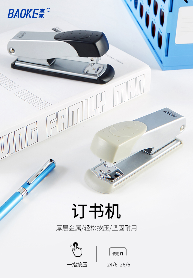 核心参数 品牌:宝克(baoke) 类型:普通订书机 型号:ST1112 外壳材质:合金 颜色:灰/黑 适用书针:24/6 26/6 订纸厚度:8毫米 包装数量:1个 尺寸(长×宽×高):12.4*3.5*5.5厘米 包装清单 包装清单 订书机x1 主体 品牌 宝克(baoke) 类型 普通订书机 型号 ST1112 外壳材质 合金 颜色 灰/黑 功能 适用书针 24/6 26/6 订纸厚度 8毫米 规格 包装数量 1个 尺寸(长×宽×高) 12.4*3.5*5.5厘米 包装尺寸 13*4*6厘米 净重量 0.21千克